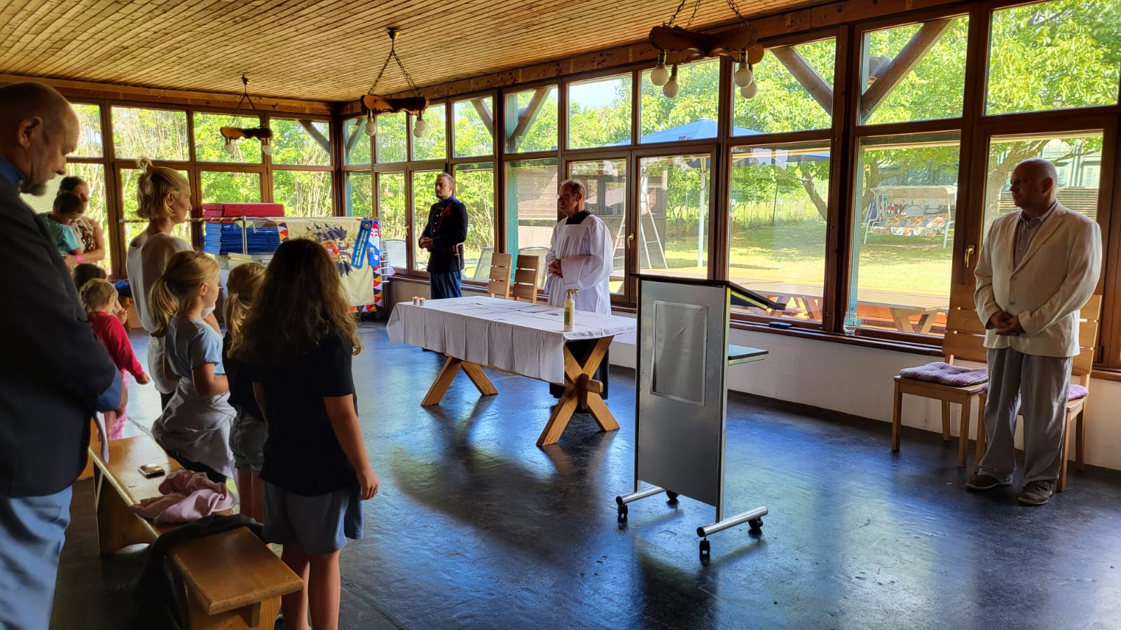Danach klang der Abend am Lagerfeuer aus und die Camper bezogen ihre Zelte. Zum Glück hielt das Wetter einigermaßen aus und die Nacht konnte ohne Wind und Regen auf der Wiese verbracht werden. Ab den frühen Morgenstunden stand das Frühstück in der Kantine bereit und danach wurde eine stimmungsvolle Feldandacht im Schützenhaus abgehalten. Mit abschließender Verpflegung beim Frühschoppen fand das Sommercamp seinen Ausklang und nach Abbau der Zelte machten sich alle auf den Heimweg.
